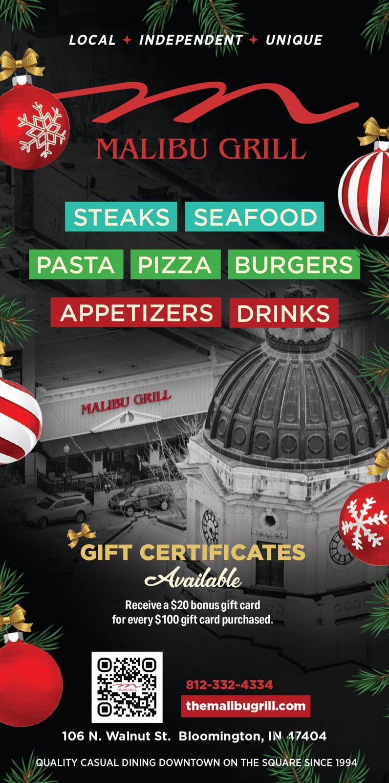 Tis the season to give and there is no other gift like an evening with Malibu Grill. Call or stop by today to pick up a gift certificate that will leave your loved one full for days.